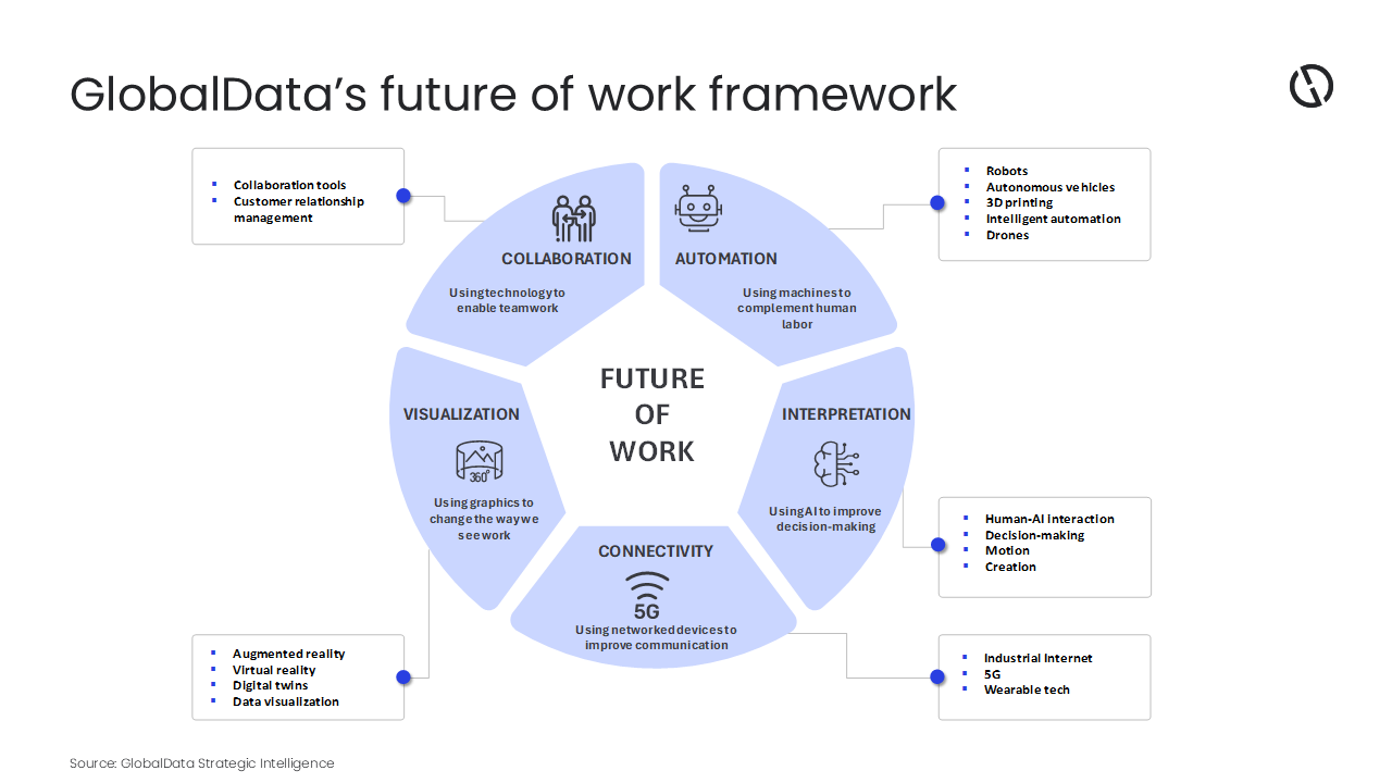 The report also sets out GlobalData’s future of work framework, which highlights the technologies disrupting work and workplaces. The future of work will reshape both factories and offices, encouraging greater collaboration between humans and technology and empowering workers with new skills. It will entail profound economic change but also poses significant social and ethical challenges. Each category in GlobalData’s future of work framework focuses on a specific role that technology can play. However, in reality, the future of work will involve the intersection of multiple technologies to the extent that the boundaries between these categories will become blurred.